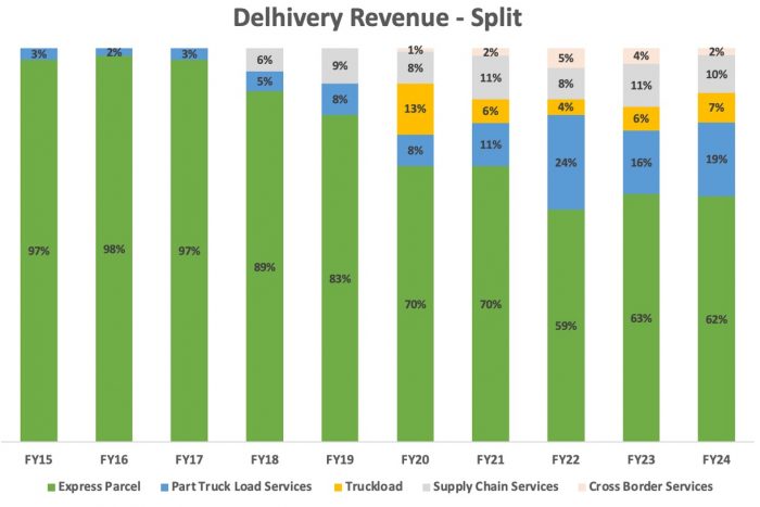 - Supply Chain Services: Delhivery continues to add new clients in auto & auto spare parts, healthcare, home furnishing, beauty & personal care and consumer electronics. With the completion of the acquisition of Algorhythm Technologies in January, 2023, Delhivery plans to enhance their SCS (Supply Chain Services) offerings with inventory management and transport optimization solutions. The revenue from SCS has slightly dipped by 1% in FY2024. Supply chain services require a large amount of capital expenditure and have a longer turnaround time. Having onboarded new clients for SCS in FY2024, the revenue stream could be expected the following year.